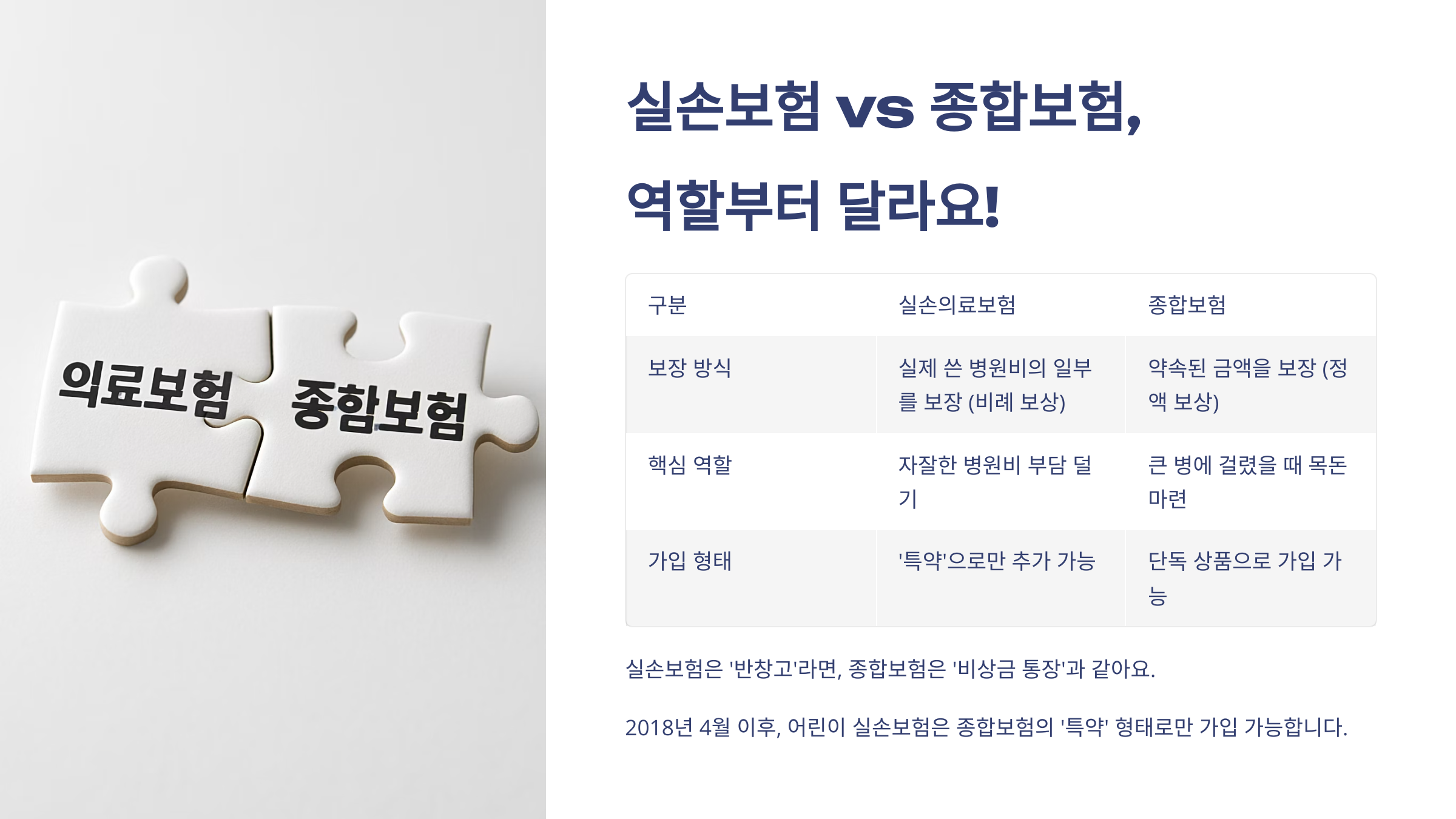 가장 많이 헷갈려 하시는 부분이에요. 이름이 비슷해서 '둘 중 하나만 들면 되겠지' 생각하기 쉽지만, 사실 두 보험은 보장하는 내용과 목적이 완전히 다른, 서로를 보완해주는 짝꿍 같은 사이랍니다. 표로 간단하게 비교해 볼까요?