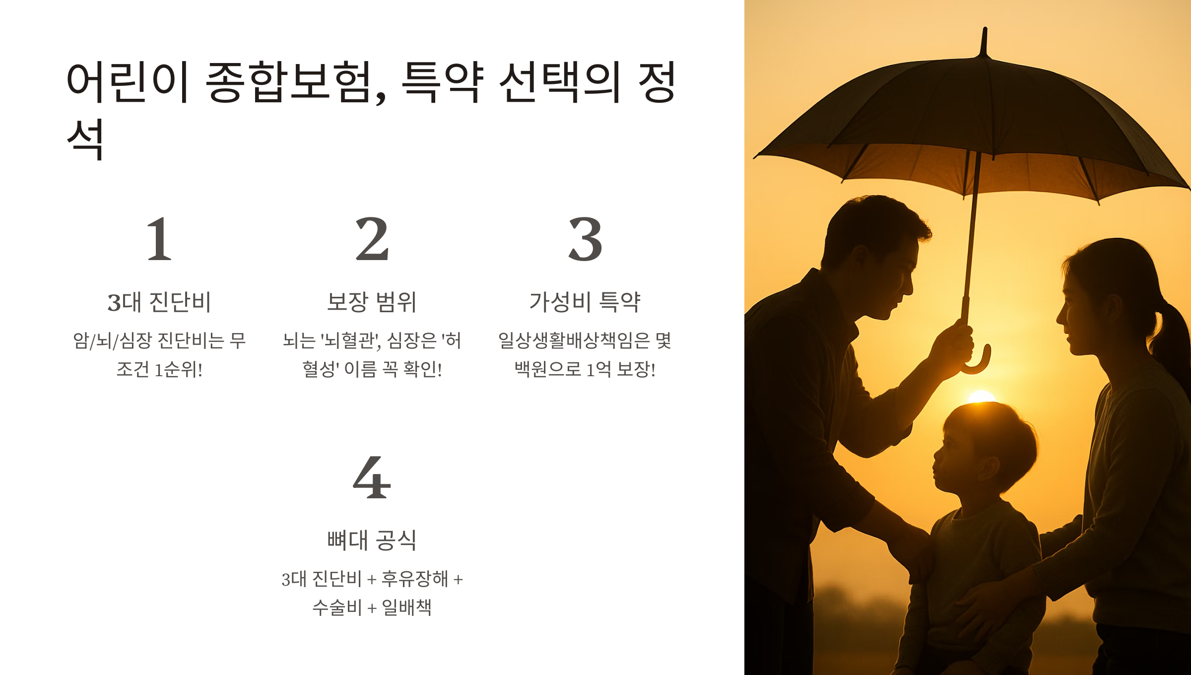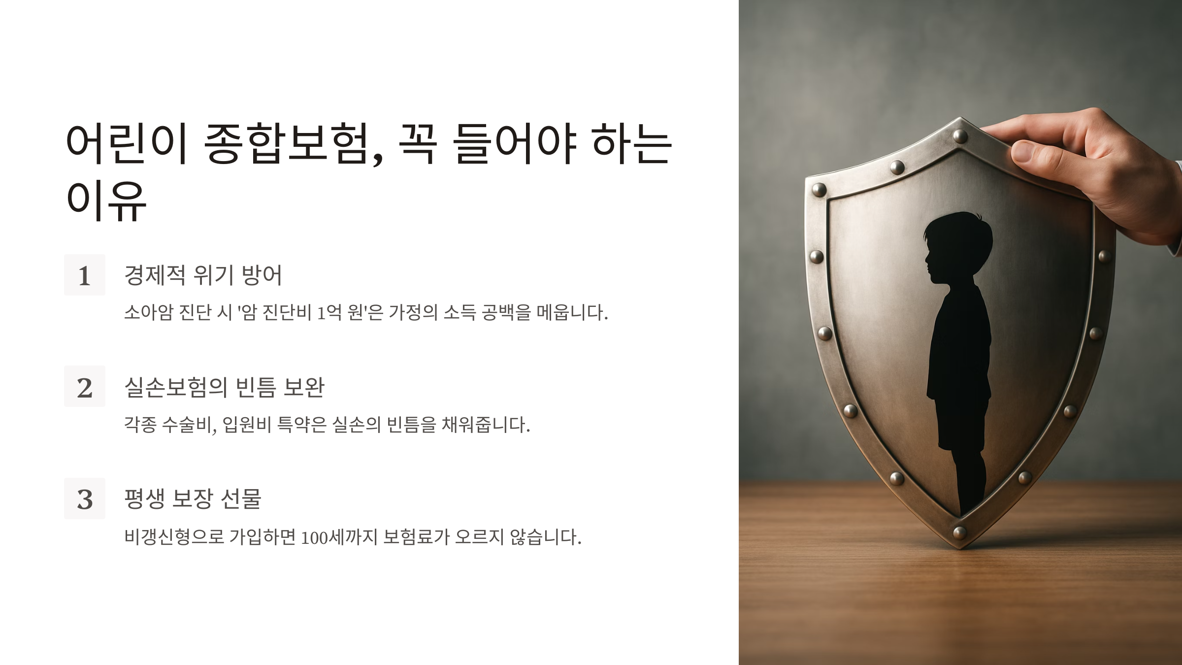 만약 아이가 소아암 진단을 받는다면, 병원비는 실손으로 해결되지만 부모 중 한 명은 간병을 위해 직장을 그만둬야 할 수 있습니다. 이때 종합보험에서 나오는 '암 진단비 1억 원'은 가정의 소득 공백을 메우고 치료에만 집중할 수 있게 해주는 생명줄이 됩니다. - 실손보험의 빈틈을 완벽하게 보완해요.