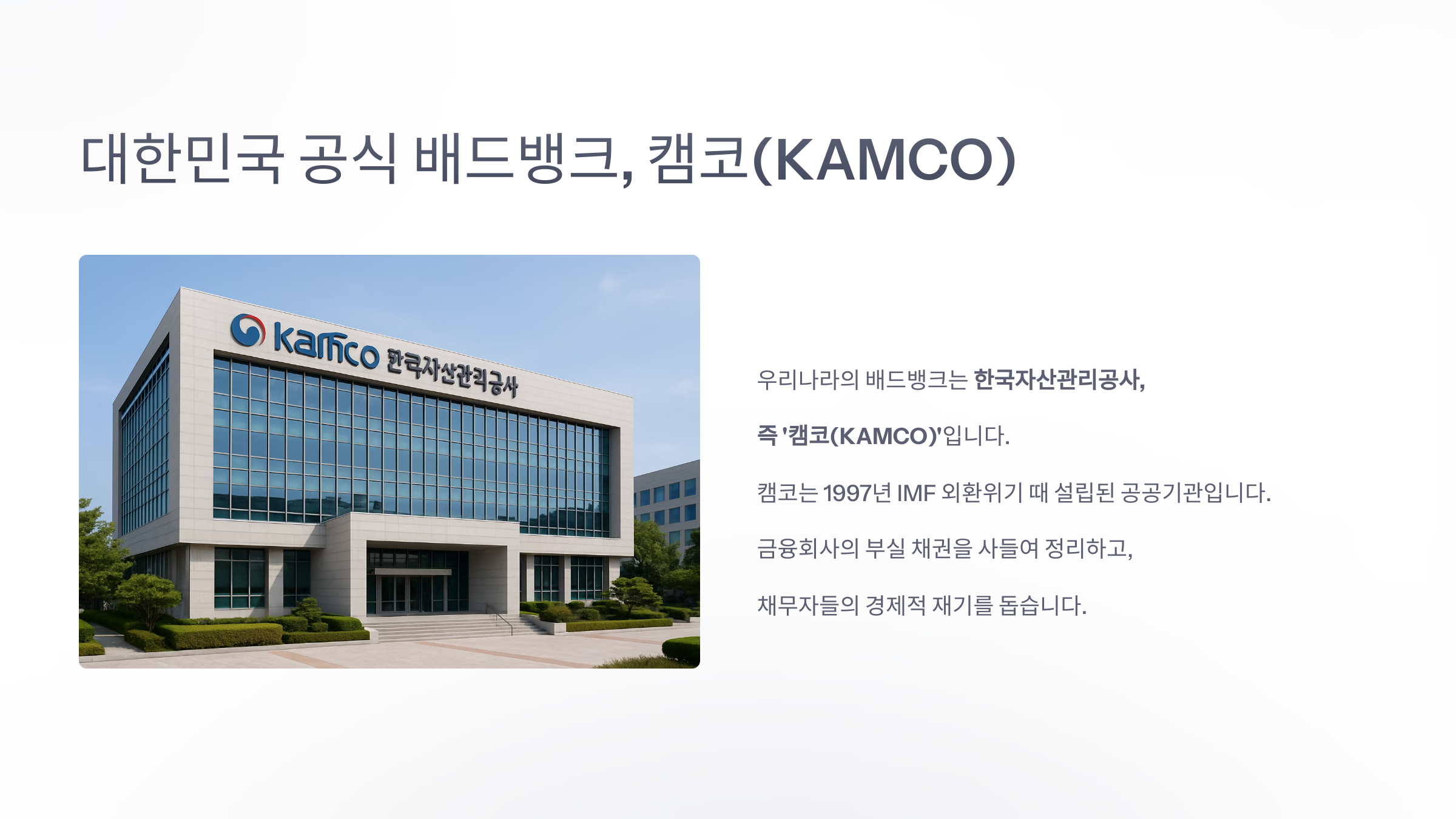 그렇다면 우리나라의 배드뱅크는 어디일까요? 바로 서두에 언급된 한국자산관리공사, 즉 '캠코(KAMCO)'입니다. 캠코는 1997년 IMF 외환위기 때, 수많은 은행들이 부실 채권 문제로 쓰러지자 이를 해결하기 위해 설립된 공공기관입니다. 그때부터 지금까지 금융회사의 부실 채권을 사들여 정리하고, 채무자들의 경제적 재기를 돕는 대한민국 공식 배드뱅크의 역할을 톡톡히 하고 있습니다.