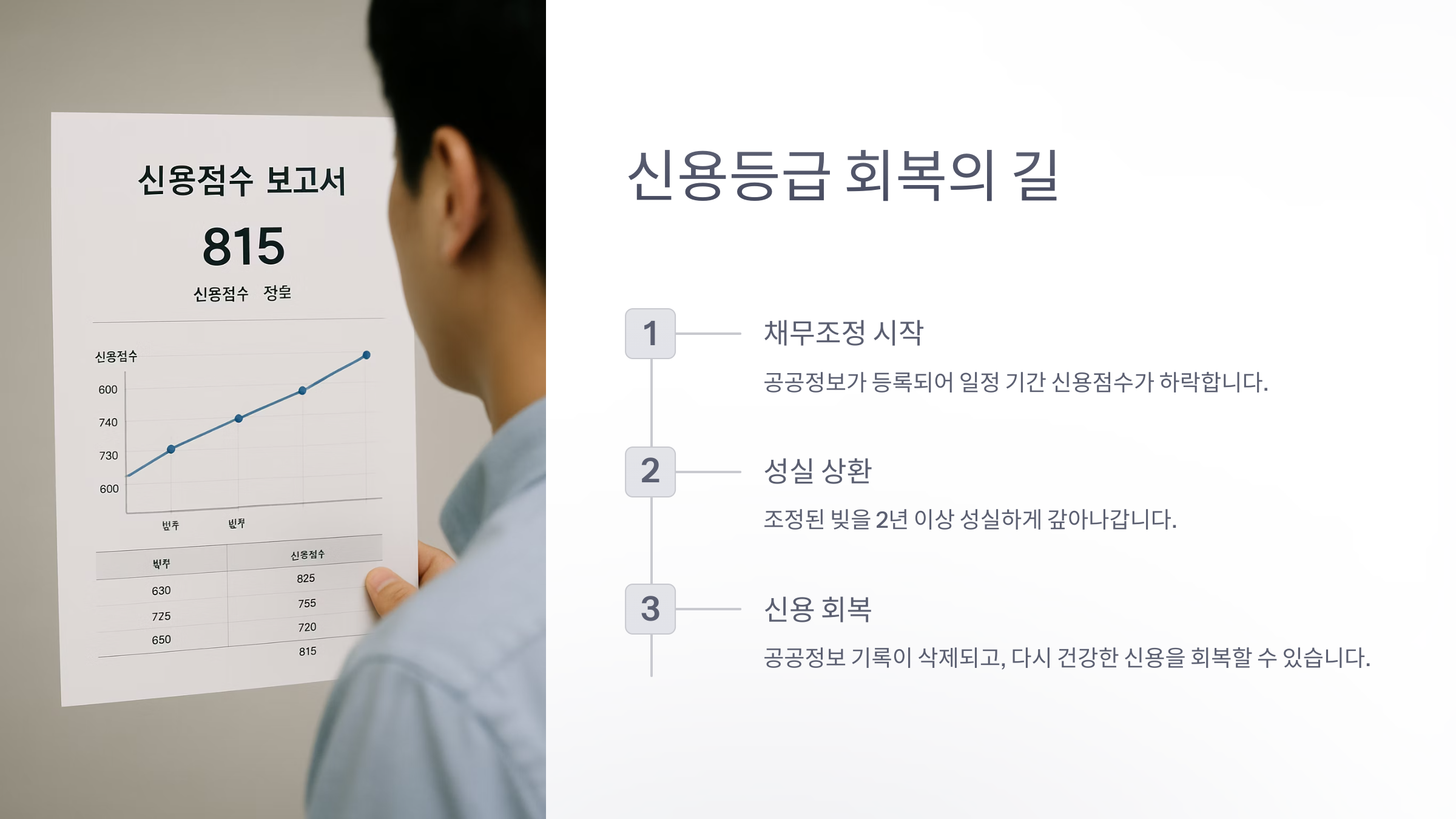 솔직하게 말씀드리면, 캠코 등을 통해 채무조정을 받으면 '공공정보'가 등록되어 일정 기간 신용점수가 하락하고 금융 거래에 제약이 생깁니다. 하지만 이는 연체를 방치했을 때의 끝없는 신용 하락에 비하면 '관리가능한 위험'입니다. 조정된 빚을 2년 이상 성실하게 갚아나가면 공공정보 기록이 삭제되고, 다시 건강한 신용을 회복할 수 있는 발판이 됩니다!