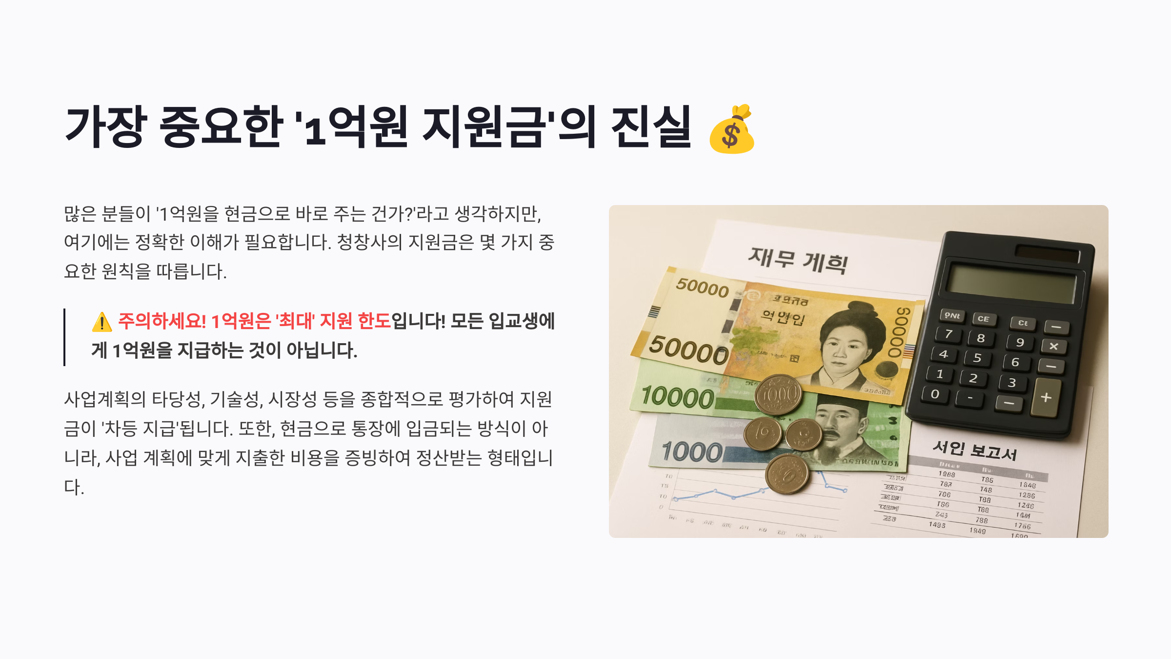 많은 분들이 '1억원을 현금으로 바로 주는 건가?'라고 생각하지만, 여기에는 정확한 이해가 필요합니다. 청창사의 지원금은 몇 가지 중요한 원칙을 따릅니다.