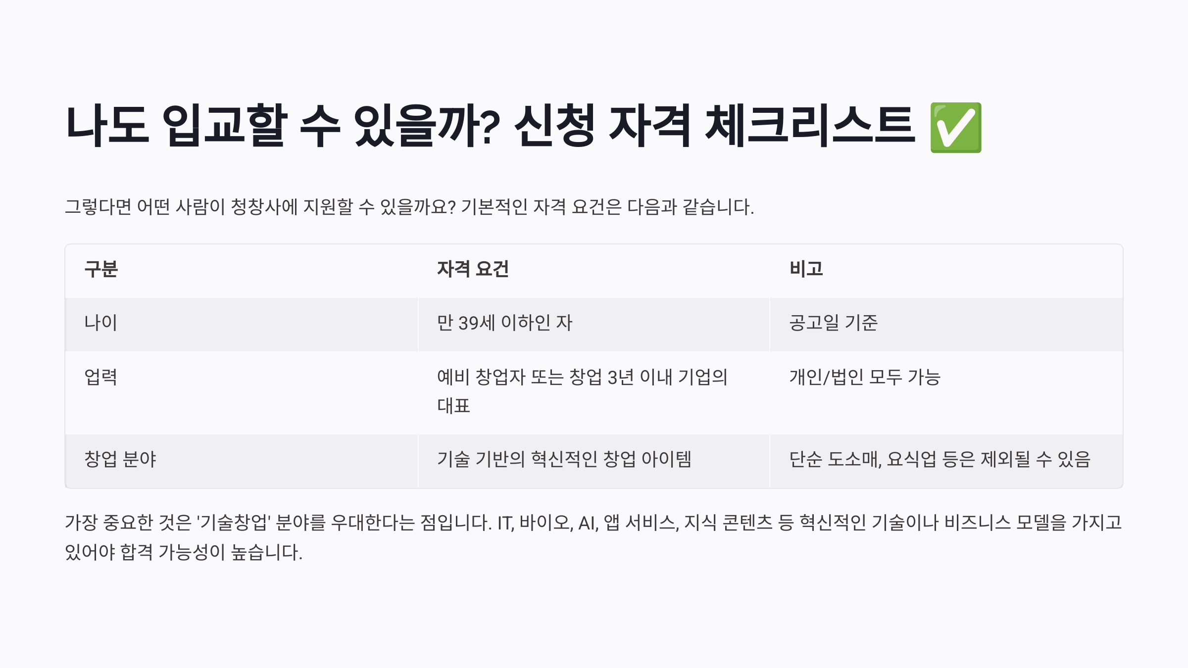가장 중요한 것은 '기술창업' 분야를 우대한다는 점입니다. IT, 바이오, AI, 앱 서비스, 지식 콘텐츠 등 혁신적인 기술이나 비즈니스 모델을 가지고 있어야 합격 가능성이 높습니다.