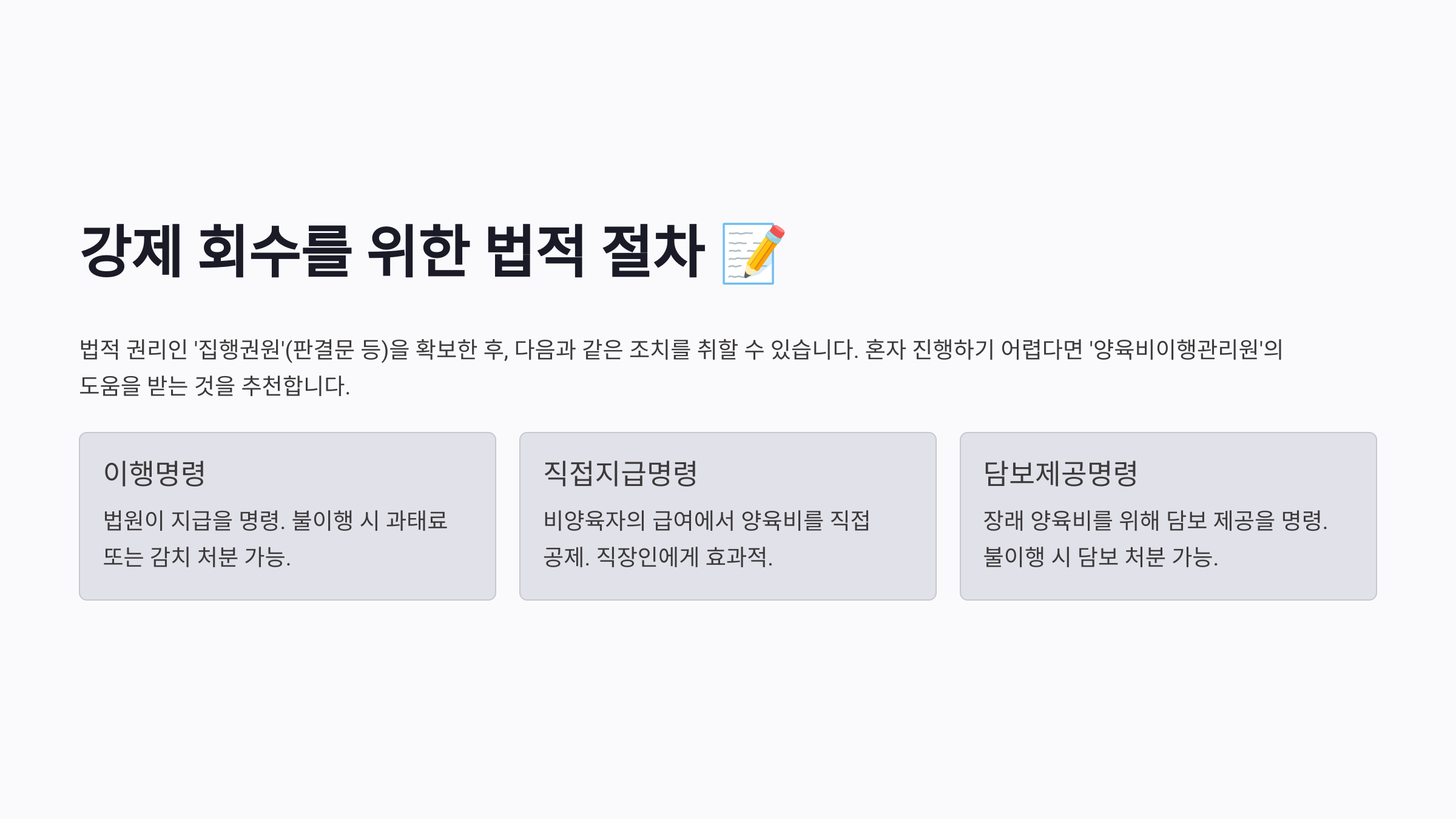 | 이행명령 | 법원이 비양육자에게 양육비 지급을 명령하는 제도. | 불이행 시 과태료(1,000만 원 이하) 또는 감치(30일 이내) 처분이 가능. |